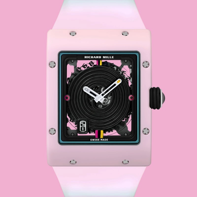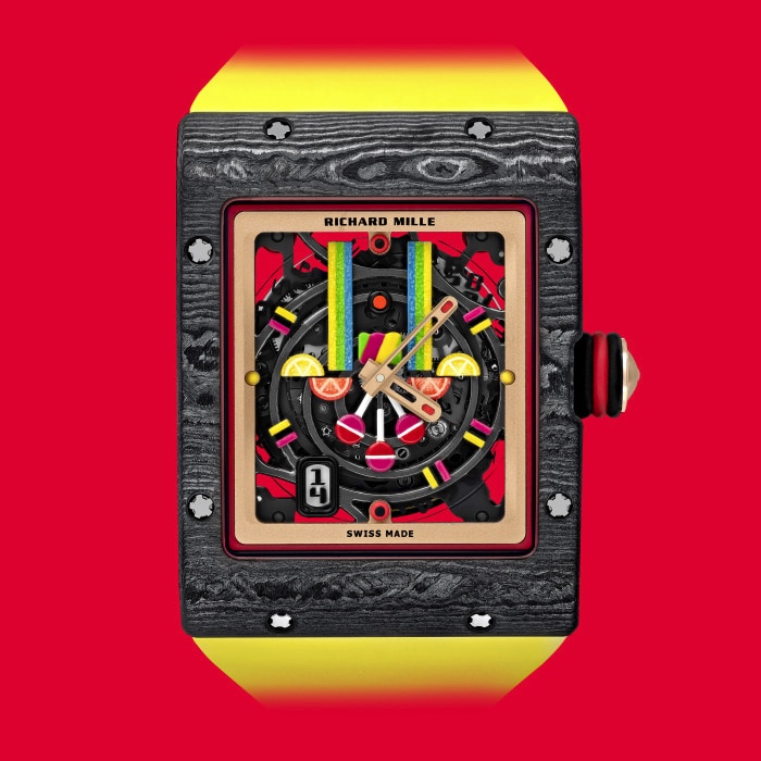 下面,就让我们共同欣赏一下其中一款精美腕表吧。理查德米尔手表每款均限量发行三十枚,以精湛的材质、色彩和造型专业技艺为依托,精心打造出两类可口“甜品”:Sweets系列与Fruits系列。其中Fruits系列腕表共推出六种口味,向甜点乐趣致敬,除了加入小型糖果造型外,更是以相互叠加的新型材质打造出符合每一款甜点主题的鲜艳色彩。