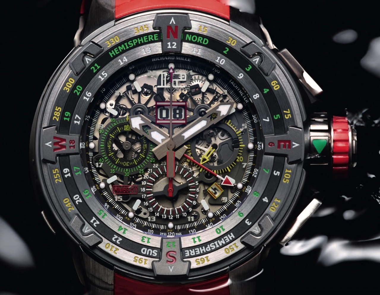 RM 60-01 Regatta les Voiles de St Barth Edition钛金自动上链机芯,小时,分钟,3点钟运行秒,年历,飞返计时码表,UTC功能和指南针。锁定表冠,防水深度达300米。
